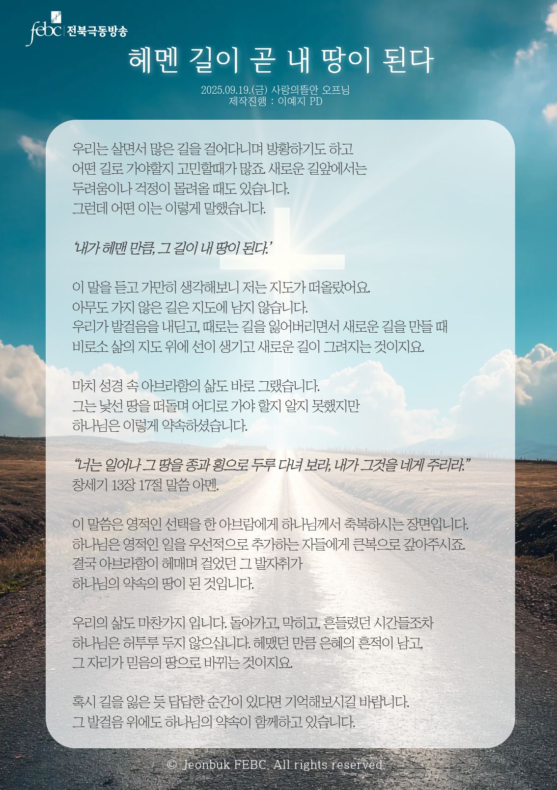 [전북] 25.09.19.(금) 사랑의뜰안 오프닝 "헤멘 길이 곧 내 땅이 된다"