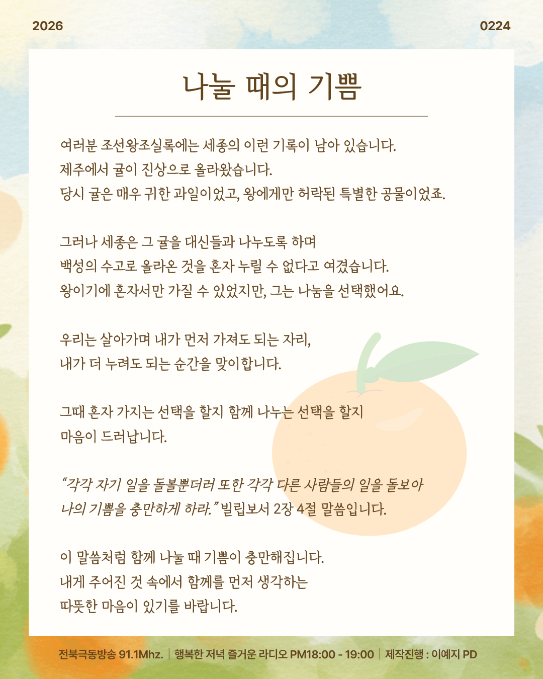 2026년 2월 24일(화) 행저즐라 오프닝 [ 나눌 때의 기쁨 ]